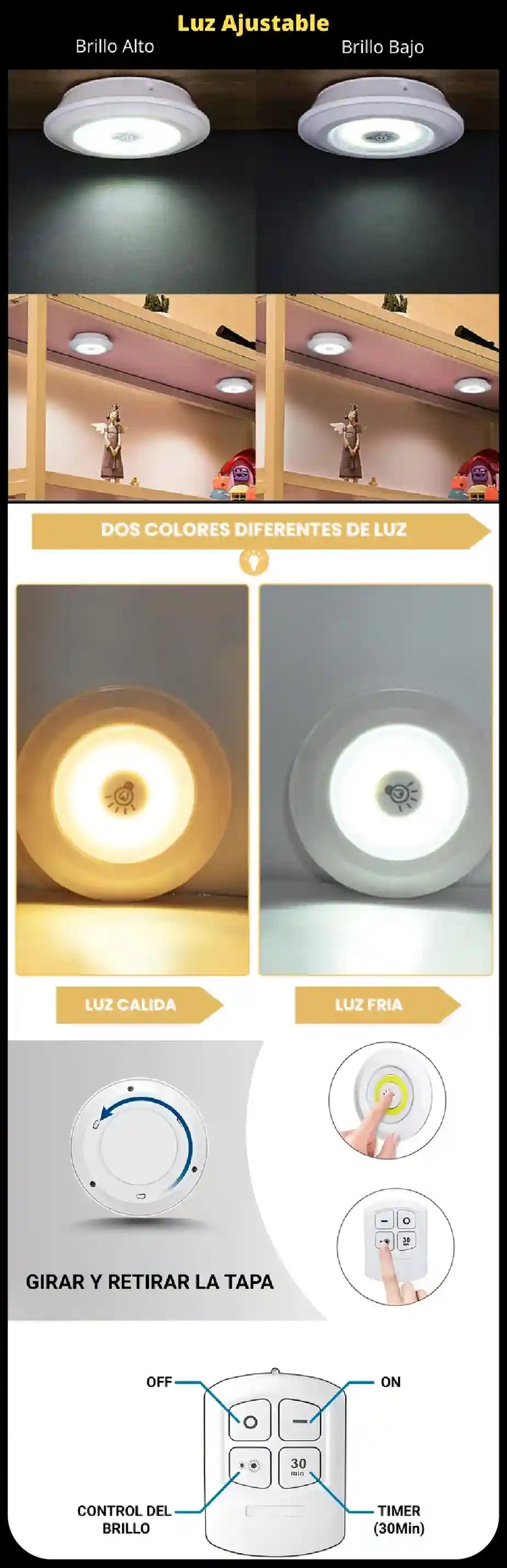 “Quedan perfectas en repisas y gabinetes. Iluminan bien y el control es muy útil.”